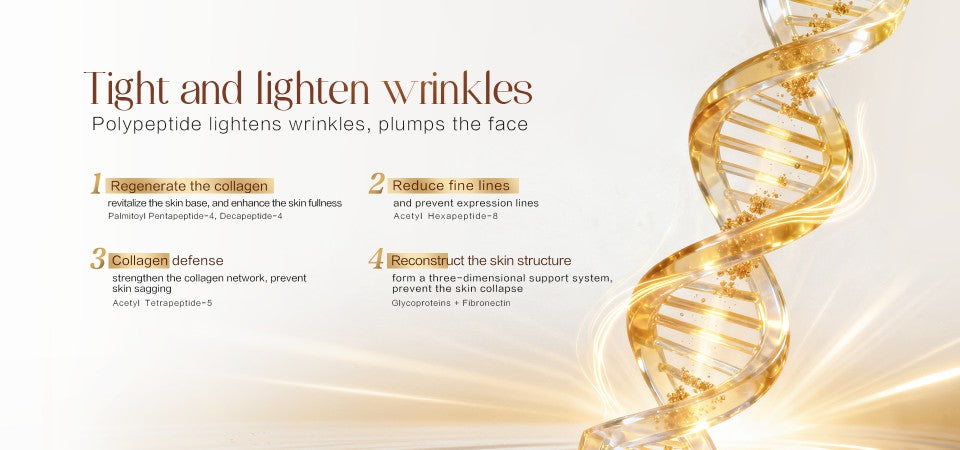 Regenerate the collagen by Palmitoyl Pentapeptide-4 and Decapeptide-4, reduce fine lines by Acetyl Hexapeptide-8, strengthen the collage network by Acetyl Tetrapeptide-5, reconstruct the skin structure by Glycoproteins and Fibronectin.