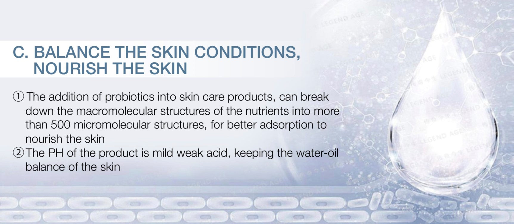- The addition of probiotics into skin care products, can break down the macromolecular structures of the nutrients into more than 500 micromolecular structures, for better adsorption to nourish the skin