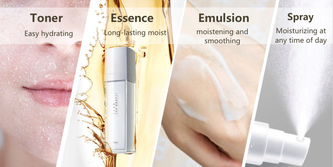 • Load image into Gallery viewer, 3 in 1 Legend Age Emulsion Spray is combining toner, essence and emulsion function. Its rich essence ingredients and high-tech helping the better absorption can give you a plumping and younger look. The quality of this product has certified by many assessments, meets both EU and US import standards (including SGS assessment and FDA registration).