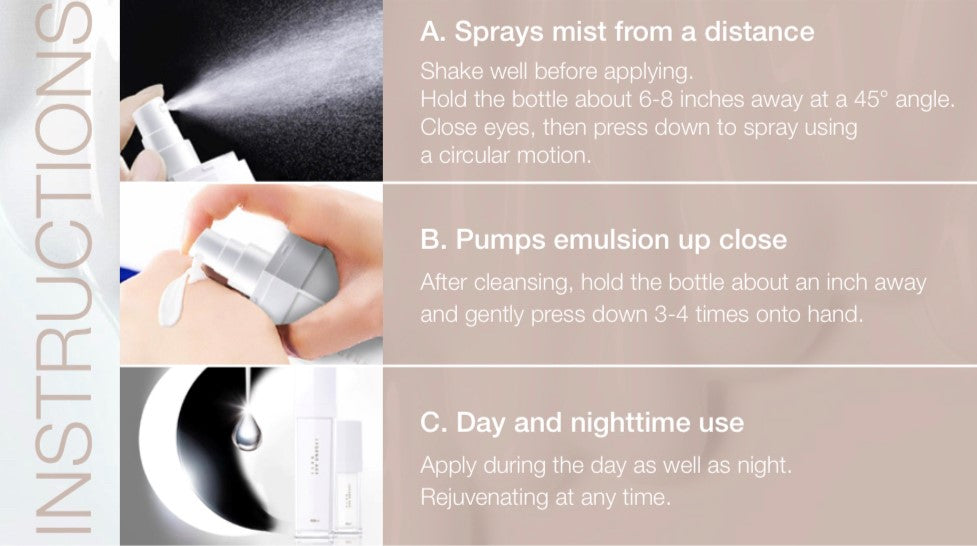3 in 1 Legend Age Emulsion Spray is combining toner, essence and emulsion function. Its rich essence ingredients help you to have a plumping and younger look. Two ways to use any time and can be used as makeup setting spray.
